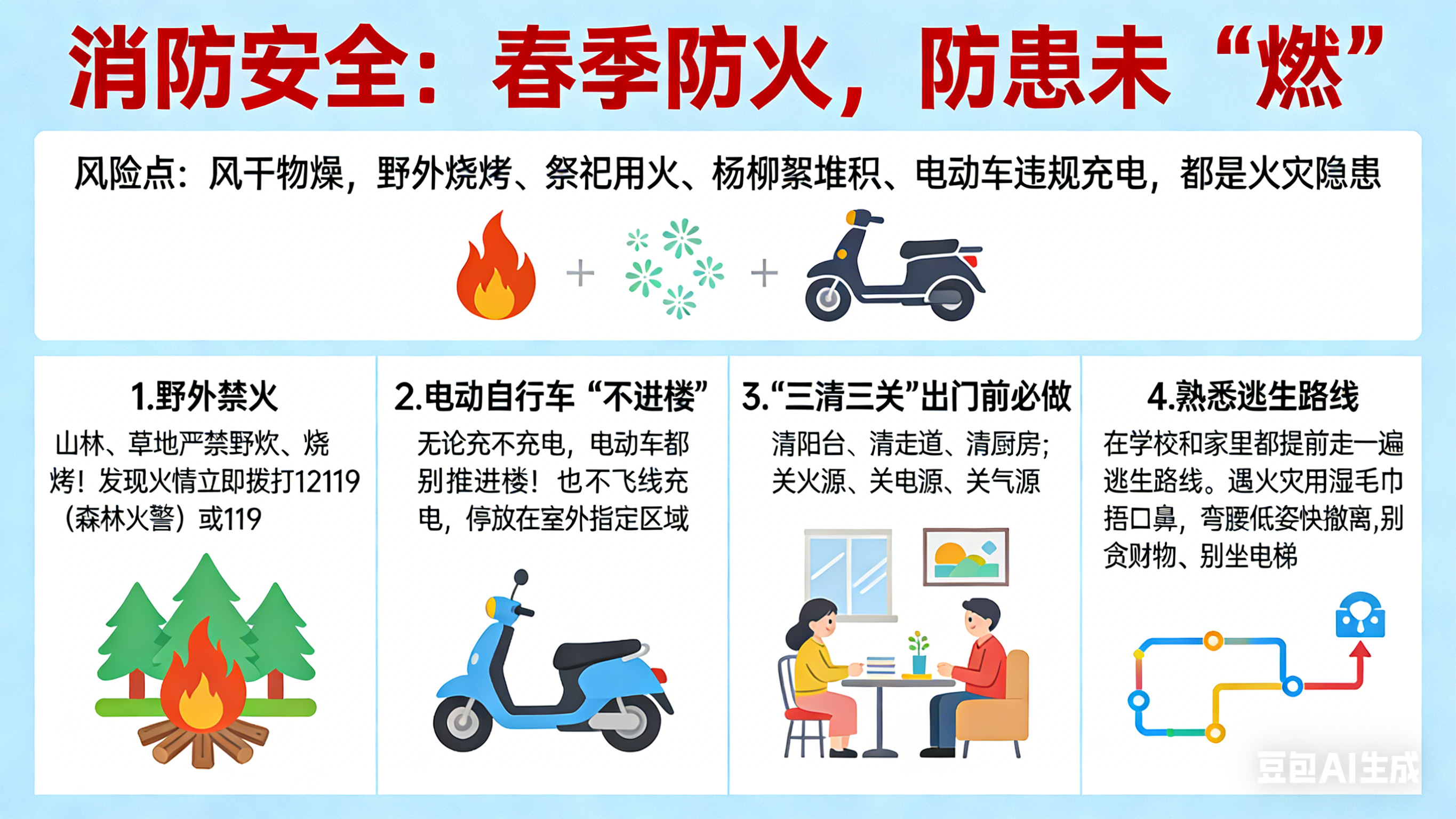 4.熟悉逃生路线——在学校和家里都提前走一遍逃生路线。遇火灾用湿毛巾捂口鼻,弯腰低姿快撤离,别贪财物、别坐电梯。
