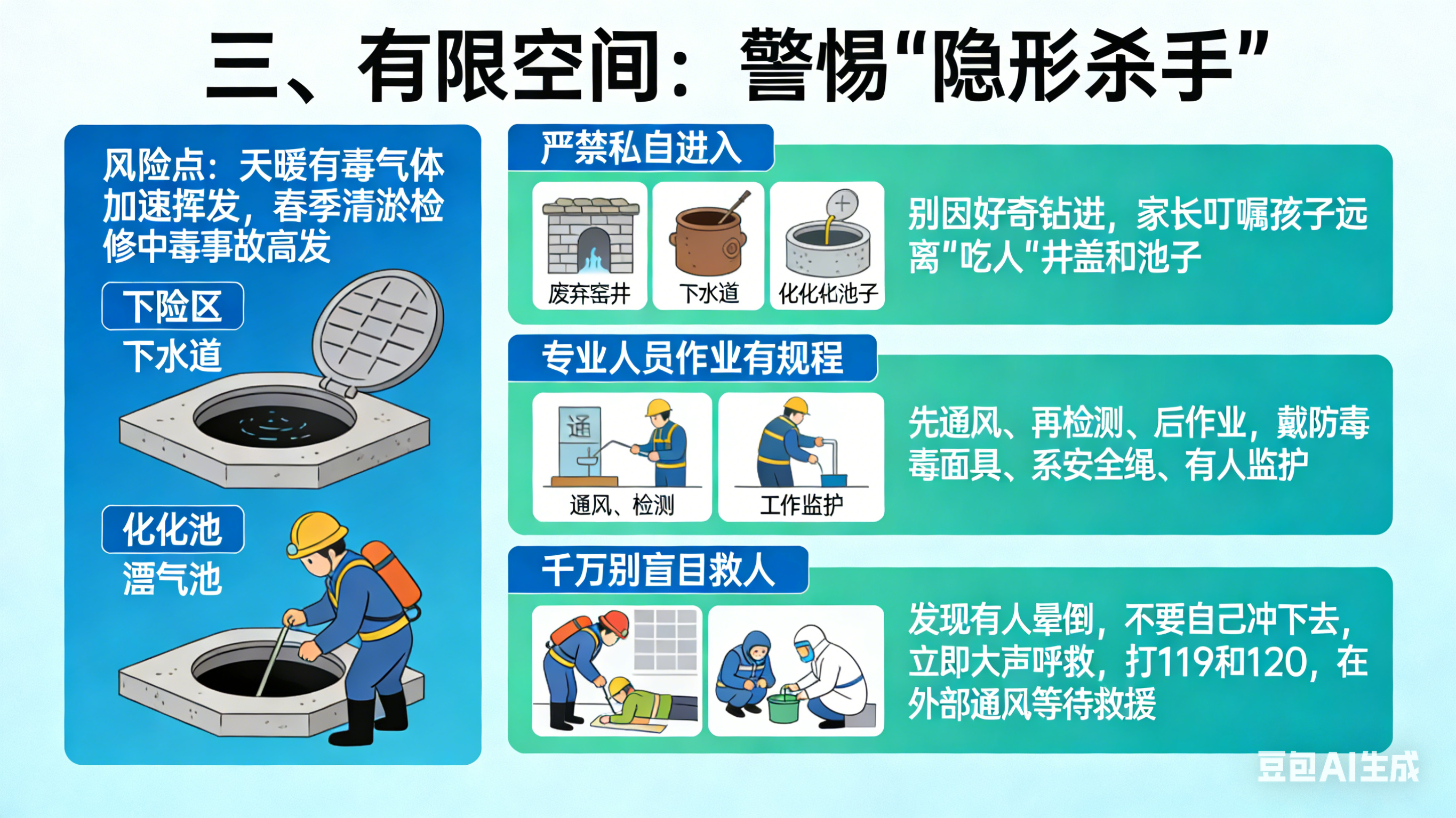 风险点:天暖了,下水道、化粪池、沼气池里的有毒气体加速挥发。春季清淤检修多,中毒事故高发。