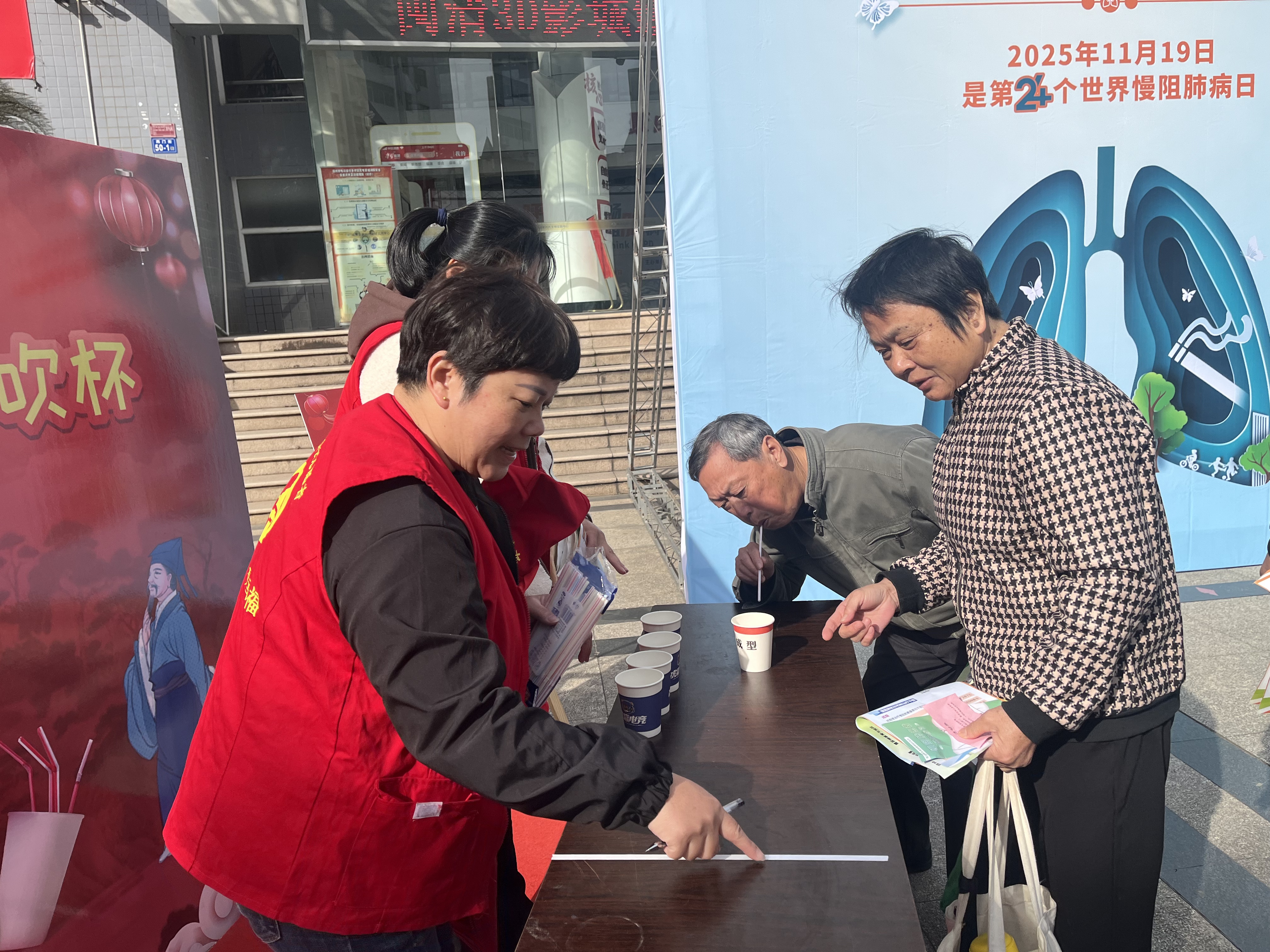 活动现场通过发放宣传单,展示慢阻肺防治相关信息及图片展板;开展有奖问答、吸管吹杯等游戏互动,增加参与者对慢阻肺预防知识的了解;现场还开展了简易肺功能检查。到场居民众多,参与度高,互动良好,气氛热烈,增强了群众对慢阻肺的防治意识。