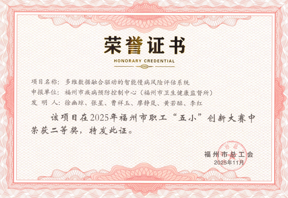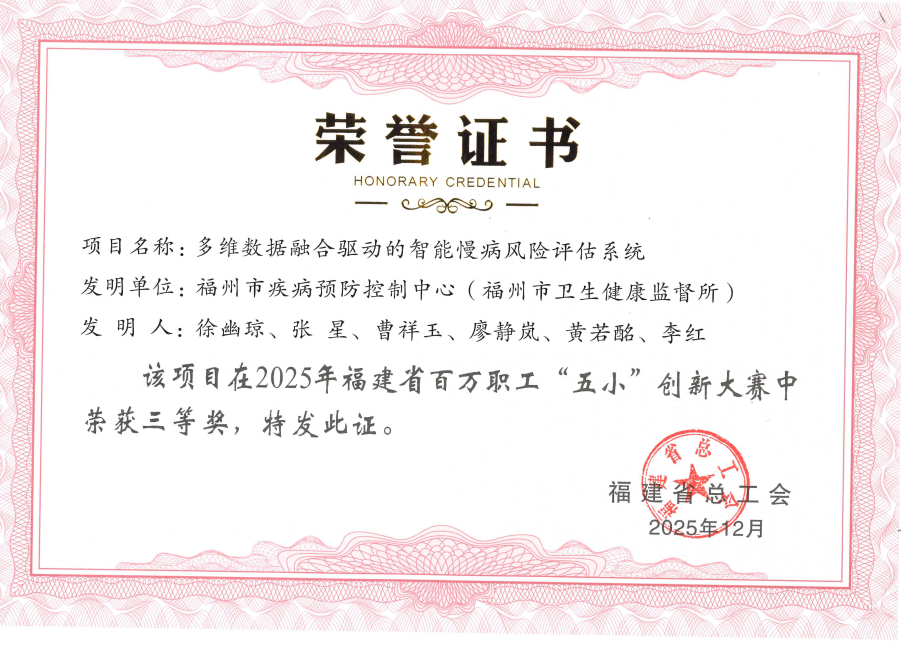近日,福州市疾病预防控制中心(福州市卫生健康监督所)申报的“多维数据融合驱动的智能慢病风险评估系统”项目,先后荣获2025年福州市职工“五小”创新大赛二等奖及福建省百万职工“五小”创新大赛三等奖,标志着我市在“智慧疾控”建设和慢病防控智能化领域的技术创新迈出了关键一步。